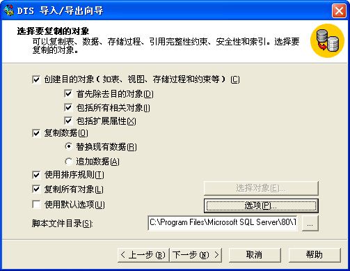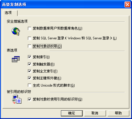 9、图8中点"选项"后会弹出图9,把"复制数据库用户和数据库角色"与"复制对象级权限"两个选项去掉,点确定回到图8接着点"下一步"进到图10。